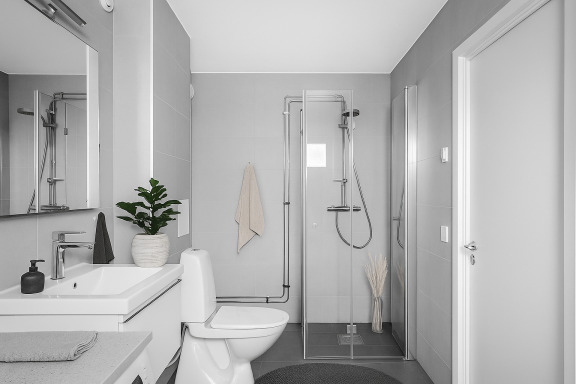 Helkaklat badrum med dusch, kommod, handdukstork, nytt porslin och badrumsskåp