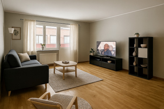 Observera att vissa bilder kan vara digitalt förbättrade med hjälp av AI-teknik för att ge en tydligare och mer representativ bild av bostaden. Mindre justeringar såsom förbättrad ljussättning, borttagning av stök eller visuell städning kan förekomma. Färger, ytskikt och inredningsdetaljer kan därför avvika något från verkligheten.