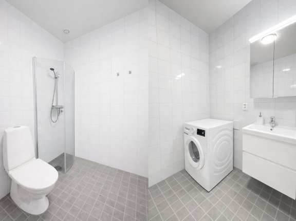 Redan i hallen möts du av ett praktiskt grått klinkergolv, förmonterad hatthylla och goda förvaringsmöjligheter. Ekparkett löper genom bostaden och de vitmålade väggarna skapar ett ljust, neutralt uttryck som gör det enkelt att sätta din egen prägel. Köket går i en stilren grå färgskala med vitkaklat stänkskydd och grå bänkskiva. Här finns gott om arbetsyta och förvaring samt full maskinell utrustning med diskmaskin, induktionshäll, inbyggnads varmluftsugn, mikrovågsugn, kyl och frys – ett funktionellt kök för både vardag och helg. Badrummet är helkaklat i vitt med grått klinkergolv och utrustat med vikbara duschväggar i glas, handdukstork, kommod och badrumsskåp. För extra bekvämlighet finns egen kombimaskin, så att du kan tvätta när det passar dig.