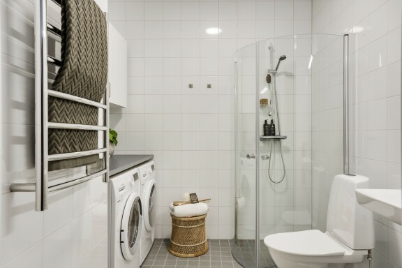Bostaden präglas av genomgående ekparkett, vitmålade väggar och stora fönster som ger ett härligt ljusflöde och en luftig känsla. Hallen är praktiskt utformad med klinkergolv i grå ton och erbjuder goda förvaringsmöjligheter. Den öppna planlösningen mellan kök och vardagsrum skapar en rymlig och inbjudande atmosfär – perfekt för både avkoppling och sociala tillställningar. Köket är inrett i tidlöst vitt med vitkaklat stänkskydd och grå bänkskiva som ger ett modernt uttryck. Här finns diskmaskin, spis samt kyl och frys, vilket ger dig alla förutsättningar för en smidig och inspirerande matlagning. Det fräscha badrummet är helkaklat i vitt med grått klinkergolv och utrustat med dusch med glasdörrar samt handdukstork. Egen tvättmaskin och torktumlare ger extra komfort och gör vardagen enklare. Från lägenheten nås en uteplats i söderläge där du kan njuta av solen under stora delar av dagen. Förvaringsmöjligheterna är generösa med garderober och integrerade förråd i bostaden, vilket gör det enkelt att hålla ordning och skapa ett harmoniskt hem.