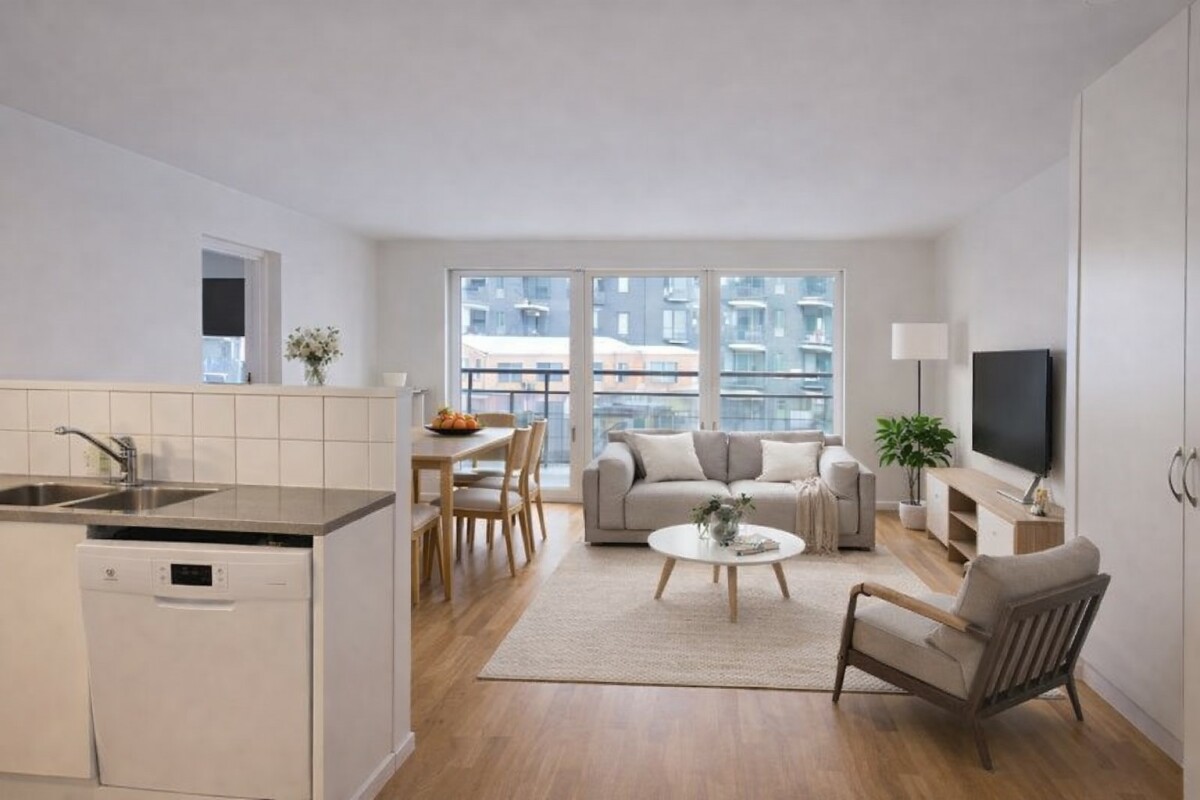 Lägenheten erbjuder ett öppet och socialt samband mellan kök och vardagsrum, vilket skapar en ljus och luftig känsla. Från vardagsrummet nås den soliga balkongen i västerläge – perfekt för avkoppling större delen av dagen. Det rymliga sovrummet erbjuder gott om utrymme. Ekparkett löper enhetligt genom samtliga rum och bidrar till ett modernt och varmt intryck.