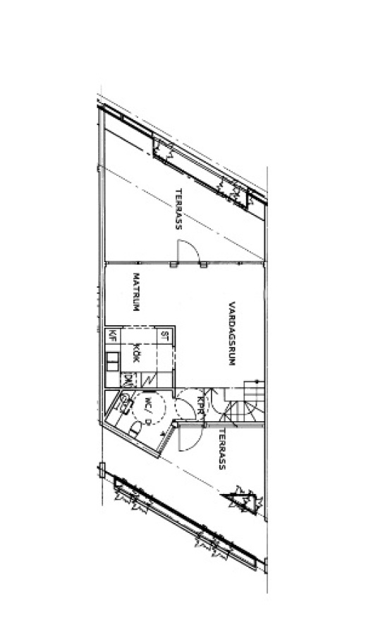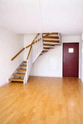 Lägenheten är fördelad över två plan med en tydlig och funktionell planlösning. På entréplan finns hall, badrum samt en öppen planlösning mellan kök och vardagsrum som skapar en social och inbjudande miljö. Köket har ljusa luckor och är utrustat med spis och ugn, kyl och frys, spisfläkt samt diskmaskin.