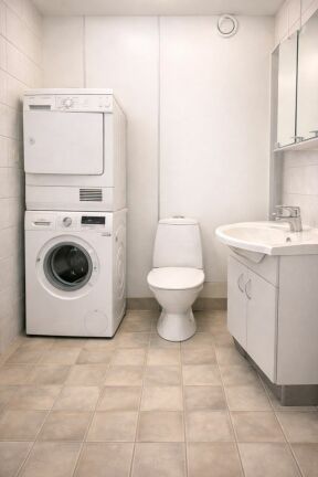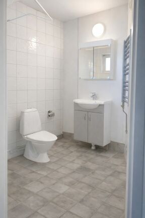 Båda badrummen är helkaklade och stilrent utformade med dusch, wc, tvättställ och vattenburen handdukstork. Hiss finns från markplan och förråd tillhör lägenheten, placerat i källarplan eller i gårdshus.