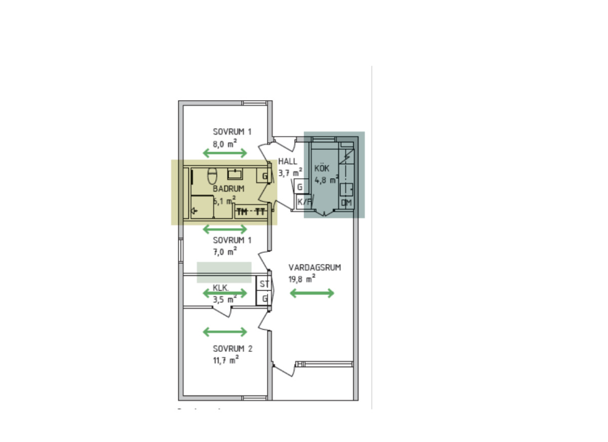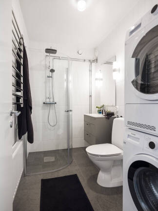 Högkvalitativa kök från Kvänum med pärlgröna luckor och en helintegrerad diskmaskin samt bänkskiva med Sigvard Bernadottes kända designmönster Virrvarr. Här finns även spis med häll/ugn, kyl/frys och spisfläkt. Totalrenoverat badrum med dusch, tvättställ, handdukstork , golvvärme. I badrummet finner du även tvättmaskin och torktumlare.