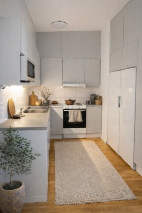 Lägenheten har egen entré från loftgång och en välkomnande hall med intilliggande, rymlig klädkammare som ger gott om förvaring. Planlösningen är genomgående med ett öppet samband mellan kök och vardagsrum, vilket skapar en social och luftig känsla med plats för både matplats och soffgrupp. Från vardagsrummet nås den extra stora balkongen i västerläge – en perfekt plats för eftermiddagssol och kvällar utomhus. Köket är stilrent med släta, ljusa luckor och utrustat med spis/ugn, spisfläkt samt kyl och frys. Lägenheten har parkettgolv i samtliga rum och ljusa väggar som förstärker ljusinsläppet. Badrummet är funktionellt och utrustat med dusch, wc, tvättställ, spegelskåp, handdukstork samt tvättpelare. Kakel finns i duschutrymmet och våtrumsmatta på golvet. Det finns två sovrum. Det första rymmer enkelt en dubbelsäng och har en generös skjutdörrsgarderob. Det andra sovrummet nås via två skjutdörrar från vardagsrummet, har plats för dubbelsäng och även här finns en praktisk skjutdörrsgarderob.