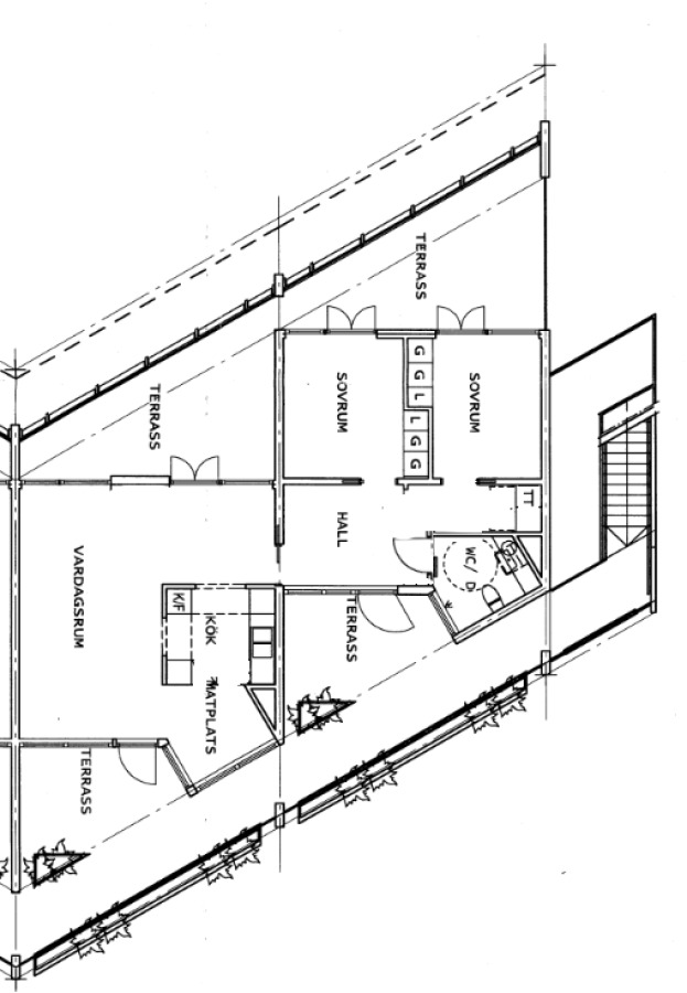 Egen entré från loftgång. Hall med garderob. Genomgående lägenhet, kök med matplats och vardagsrum i anslutning. Från vardagsrummet nås balkongen, modell större i rakt västerläge, samma balkong nås även från sovrummen. Ytterligare uteplats i öster från vardagsrummet. Köket har släta, ljusgrå luckor, här finns spis/varmluftsugn, spisfläkt, kyl/frys och diskmaskin. Parkettgolv i hela lägenheten och ljusa väggar. Badrummet är utrustat med dusch, wc, tvättställ, spegelskåp och handdukstork. Kaklat lokalt i duschutrymmet samt våtrumsmatta på golvet. Tvättpelare finns. Sovrum 1 med plats för dubbelsäng och med garderober, utgång till balkong. Sovrum 2, även här garderober, med utgång till balkong.