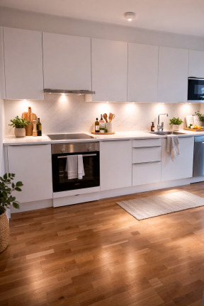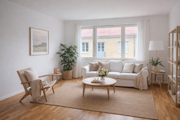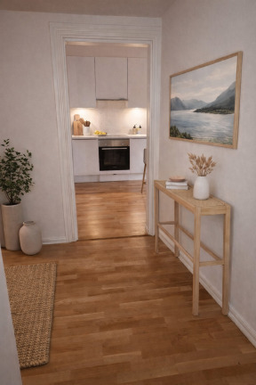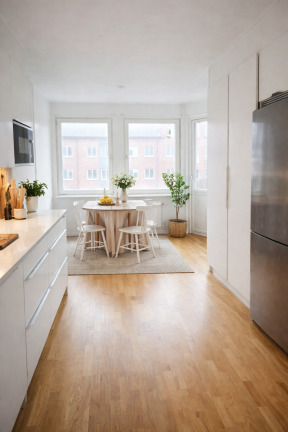 Genomgående vita väggar, tak och snickerier skapar en modern och enhetlig känsla, medan klassisk ekparkett löper genom bostaden. I hallen finns ytterligare garderober och vid entrén ligger slitstarkt klinkergolv som är både praktiskt och stilrent.