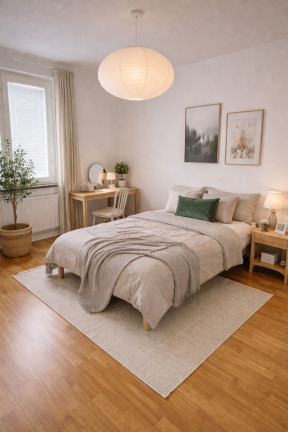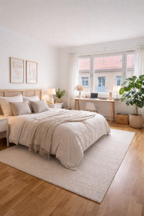 Vardagsrummet är rymligt och lättmöblerat med fint ljusinsläpp och utgång till den andra balkongen. Bostaden erbjuder tre sovrum, samtliga med garderober som ger goda förvaringsmöjligheter.