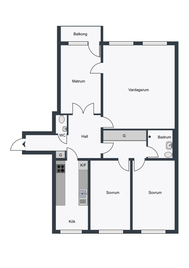 De tre sovrummen är ljusa och rymliga, medan vardagsrummet bjuder in till umgänge och middagar. Från vardagsrummet nås bostadens mindre balkong i soligt sydvästläge – perfekt för eftermiddagskaffe eller kvällssol. Genomgående vita väggar och parkettgolv skapar en ljus och harmonisk atmosfär.