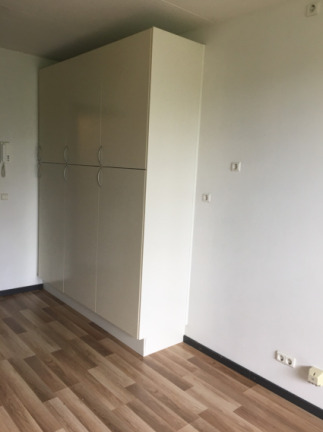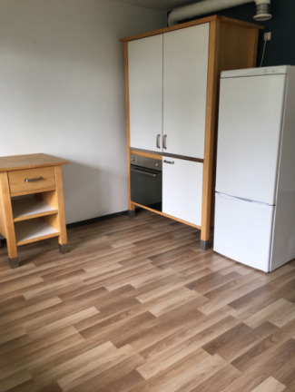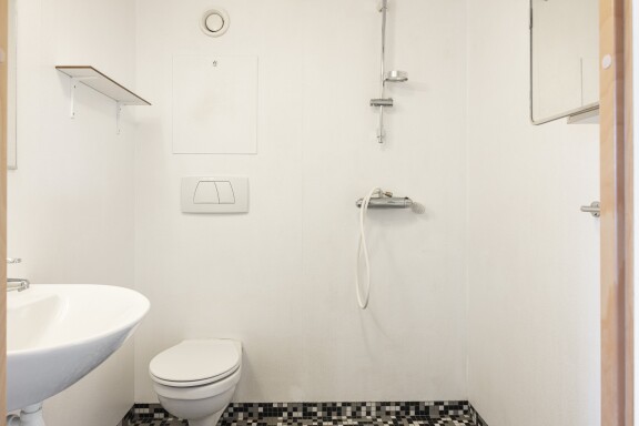 Här bor du i en välplanerad bostad med laminatgolv och vitmålade väggar som ger ett fräscht intryck. Köket är ett trinettekök utrustat med spis, ugn, fläkt, kyl och frys – allt du behöver för enkel matlagning. I hallen finns garderob med bra förvaringsmöjligheter, och badrummet har målade väggar i vitt och grått klinkergolv.