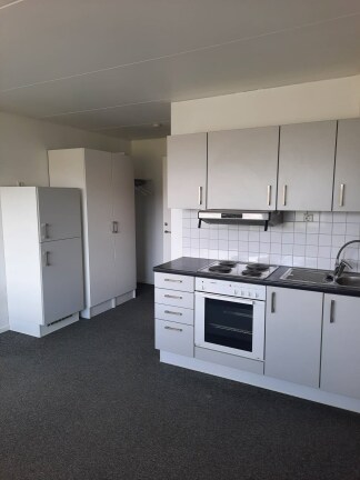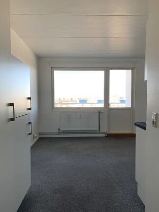 Här bor du i en välplanerad bostad med heltäckningsmatta i grått och vitmålade väggar som ger ett fräscht intryck. Köket är utrustat med spis, ugn, fläkt, kyl och frys – allt du behöver för enkel matlagning. I hallen finns garderob med bra förvaringsmöjligheter, och badrummet har våtrumstapet och grått klinkergolv.
