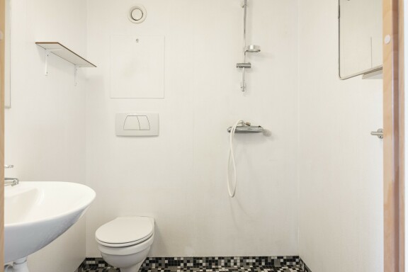 Här bor du i en välplanerad bostad med laminatgolv och vitmålade väggar som ger ett fräscht intryck. Köket är utrustat med spis, ugn, fläkt, kyl och frys – allt du behöver för enkel matlagning. I hallen finns garderob med bra förvaringsmöjligheter, och badrummet har målade väggar i vitt och grått klinkergolv.