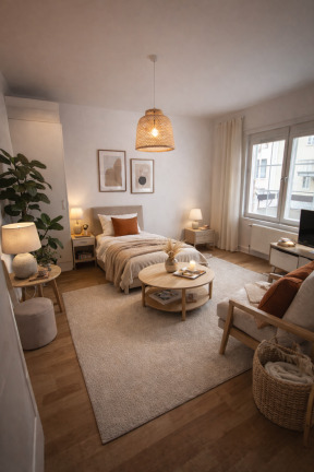 Rummet har plats för både säng och övrigt möblemang, vilket gör det enkelt att skapa en kombinerad sov- och vardagsdel. Laminatgolv och ljusa ytskikt ger en stilren och lättmöblerad bas.