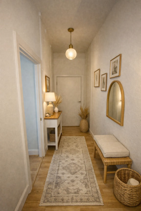 Bostaden erbjuder en genomtänkt planlösning och generös takhöjd som skapar en trivsam känsla.