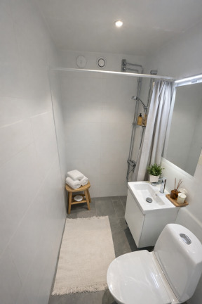 Det helkaklade badrummet går i tidlösa färger med vitt kakel och ljus klinker. Här finns dusch, kommod samt elektrisk golvvärme och handdukstork som ger extra komfort.