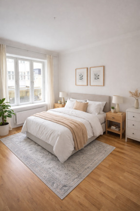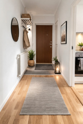 Hallen har ett slitstarkt klinkergolv som övergår i ett vackert parkettgolv som löper vidare genom bostaden. Allrummet är smart planerat med plats för både säng och mindre soffgrupp. Två garderober ger bra förvaringsmöjligheter och bidrar till ett välorganiserat hem.