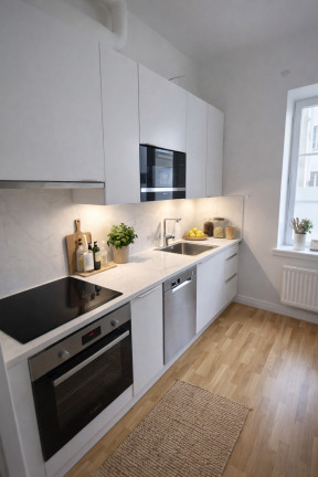 Det separata köket är inrett med vita köksluckor från HTH och erbjuder god förvaring. Den maskinella utrustningen består av spishäll, kyl/frys, diskmaskin och mikro – allt du behöver för en smidig vardag.