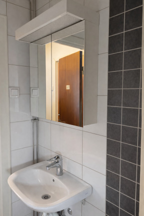 Vardagsrummet har parkettgolv med viss patina, vilket ger karaktär åt rummet. I hallen ligger ett grått klinkergolv. Badrummet är helkaklat med grått klinker och vitt kakel, utrustat med duschdraperi och får dessutom en ny kommod för bättre förvaring.