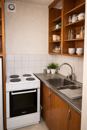 Lägenheten är enkelsidig och ligger på femte våningen med hiss. Inför inflyttning uppdateras köket med nya köksluckor, spisfläkt samt ny spis med induktionshäll och varmluftsugn. Mindre kyl med frysfack finns. Parkettgolv läggs i köket och samtliga väggar i bostaden målas för ett fräscht helhetsintryck.