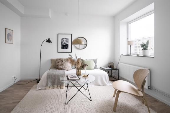 I den välkomnande hallen finner vi en smidig skjutdörrsgarderob i glas med plats för förvaring. Vidare når du köket som är rymligt och fullt utrustat med bland annat diskmaskin. Badrumet är helkaklat och utrustat med bland annat tvättpelare. Utöver detta erbjuder lägenheten plats för såväl säng som övrigt möblemang. Väggarna är vitmålade och släta. På golven är det vitlaserad ek.
