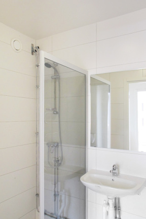 Lägenheten har vitmålade väggar, parkettgolv samt klinkergolv i badrummet. Kök med vitvaror. Badrummet är helkaklat och har duschstång samt handdukstork.