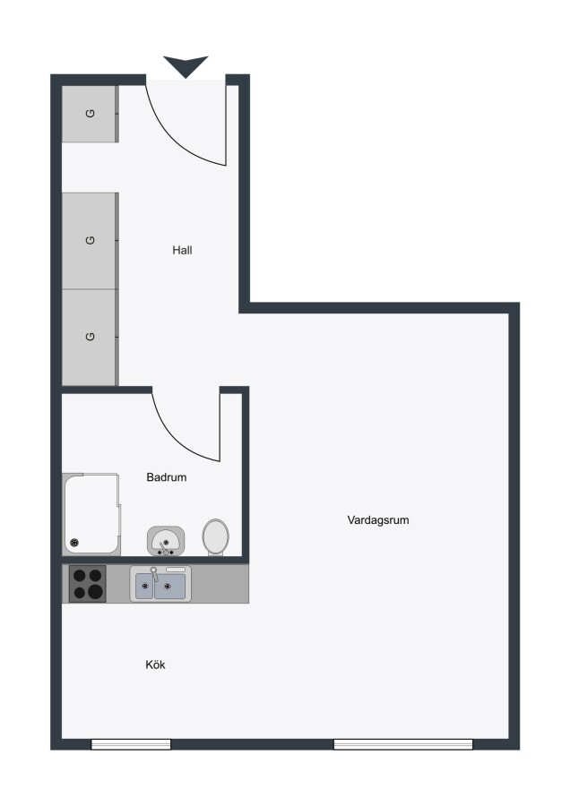 Lägenheten är belägen på våning sex och präglas av en öppen planlösning där kök och allrum samverkar på ett naturligt och luftigt sätt. Parkettgolv löper genom rummet och skapar en varm och inbjudande atmosfär. Badrummet är helkaklat och utrustat med duschväggar. I hallen finns flera garderober som erbjuder goda förvaringsmöjligheter. Fastigheten är utrustad med hiss för extra bekvämlighet.