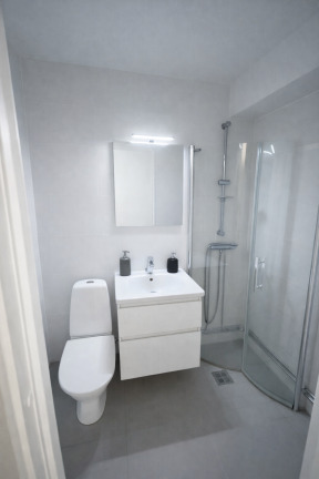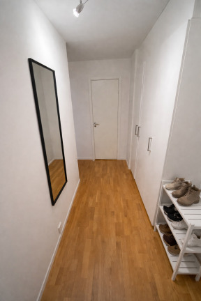 Det helkaklade badrummet håller modern standard och är utrustat med dusch och eleganta glasväggar. I hallen finns flera garderober som ger goda förvaringsmöjligheter och bidrar till en praktisk vardag.