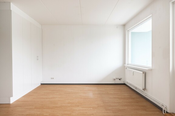 Här bor du i en välplanerad bostad med laminatgolv och vitmålade väggar som ger ett fräscht intryck. Köket är utrustat med spis, ugn, fläkt, kyl och frys – allt du behöver för enkel matlagning. I hallen finns garderob med bra förvaringsmöjligheter, och badrummet har målade väggar i vitt och grått klinkergolv.