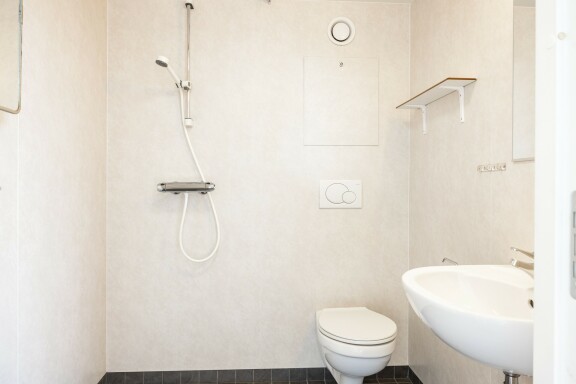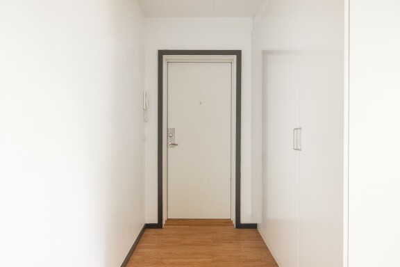 Här bor du i en välplanerad bostad med laminatgolv och vitmålade väggar som ger ett fräscht intryck. Köket är utrustat med spis, ugn, fläkt, kyl och frys – allt du behöver för enkel matlagning. I hallen finns garderob med bra förvaringsmöjligheter, och badrummet har våtrumstapet och grått klinkergolv.