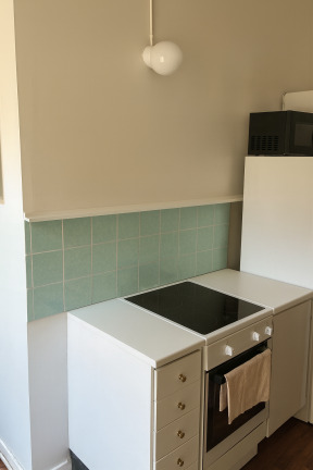 Planlösningen är enkel och funktionell med separat kök där ett mindre matbord får plats. Köket har bevarad äldre stil men kommer att kompletteras med ny spis och kolfilterfläkt, vilket gör att det får en fräsch känsla. Här finns gott om förvaringsmöjligheter och bra arbetsytor.