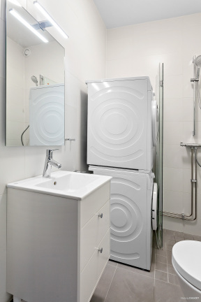 Badrummet är stilrent och praktiskt med helkaklade ytor, rymlig dusch och egen tvättpelare. Ljusa väggar i kombination med parkettgolv skapar en varm och inbjudande atmosfär i hela bostaden. Från rummet når du balkongen som vetter mot Gyllenpalmsgatan och ger en trevlig plats för avkoppling.