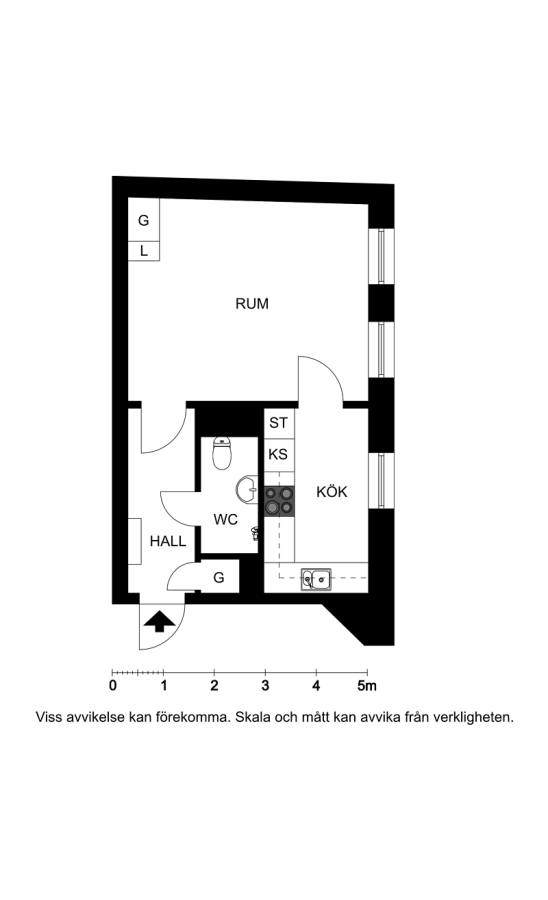 Via ytterdörren möts du av en inbjudande hall med plats för avhängning. Från hallen når du det helkaklade badrummet med vitkaklade väggar och grå klinker på golvet – en stilren kombination som ger ett fräscht intryck. Här finns wc, dusch, handdukstork och kommod.