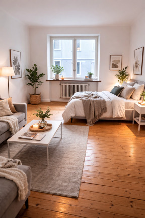 Bostaden erbjuder en genomtänkt planlösning med plats för både säng, soffa och övrigt möblemang. De tidstypiska detaljerna ger hemmet en varm och personlig känsla.