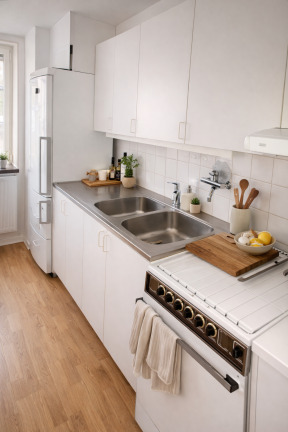 • Ljust äldre kök med fönster mot innergård, vitmålade luckor och gasspis