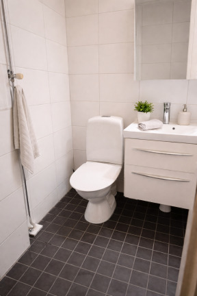 • Helkaklat badrum med mörk klinker och vita kaklade väggar