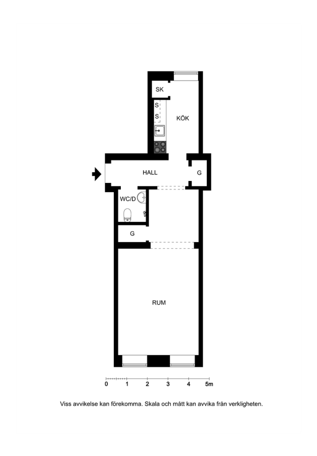 Lägenheten erbjuder original brädgolv i hall och rum som ger karaktär och värme. Rummet vetter mot gatan och har plats för både säng och soffhörna. Köket ligger mot den lugna gården och är utrustat med vita köksluckor, vitt kakel, gasspis, delad kyl/frys samt utrymme för ett mindre matbord. På golvet ligger en praktisk grå plastmatta.