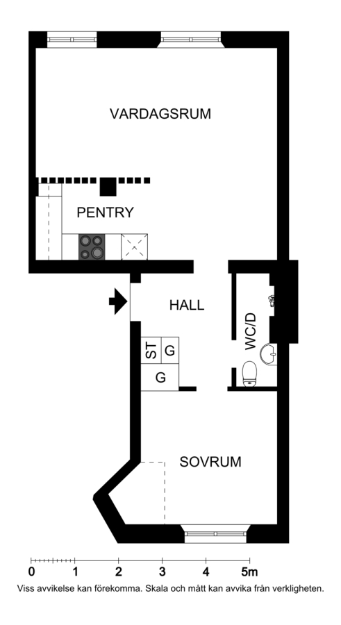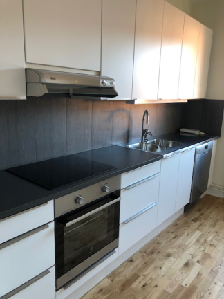 Renoverad tvåa i charmig fastighet. Samtliga väggar, tak och snickerier är vitmålade och på golvet ligger parkett. I hallen finns två garderober. Öppen planlösning mellan köket och vardagsrummet. Stilrent kök med vita luckor, induktionshäll med inbyggnadsugn, delad kyl/frys, diskmaskin och mikrovågsugn. Badrummet är helkaklat med vitt kakel och grå klinker på golvet.