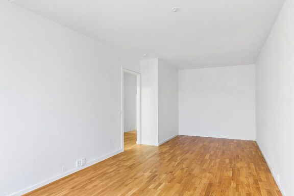 Lägenheten har vitmålade väggar och parkettgolv. Kök med vitvaror. Badrummet är helkaklat och har duschväggar och handdukstork.