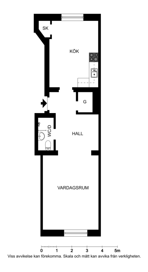Lägenheten erbjuder en genomgående planlösning med kök mot den lugna innergården och bostadsrum mot gatan, vilket skapar en fin balans mellan stadsliv och avkoppling. Köket är utrustat med gasspis och har plats för ett mindre matbord – perfekt för både vardag och enklare middagar. Badrummet är kompakt och funktionellt med dusch. En säkerhetsdörr är installerad, vilket bidrar till både ökad trygghet och minskat ljud från trapphuset. Observera att fastigheten saknar hiss och balkong.