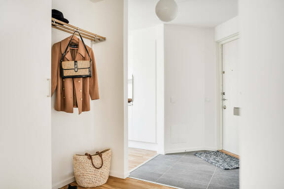Lägenheten renoverades 2023 och erbjuder en genomgående stilren interiör med parkettgolv och vita väggar som skapar en luftig och neutral bas. Hallen har praktiskt klinkergolv som både är slitstarkt och lättskött.