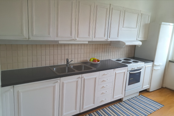 Köket ligger separat och erbjuder plats för matbord. Utförandet är äldre men funktionellt. Här finns spis, ugn och kyl/frys. Inredningen går i ljusa toner med vita luckor och ljusbeige/rosa kakel som ger ett hemtrevligt intryck.