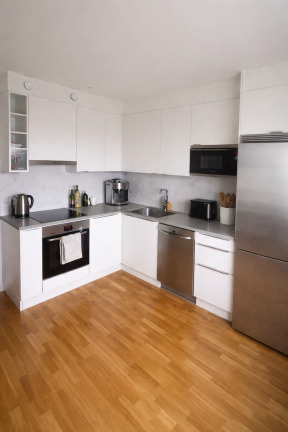 Vidare erbjuder bostaden ett rymligt kök med goda arbetsytor och förvaring i både över- och underskåp. Utrustningen i köket består av bland annat induktionshäll, ugn, kyl/frys och diskmaskin. Vardagsrummet är väl tilltaget med stora ytor för såväl matbord som soffgrupp. Via vardagsrummet kommer du ut till balkongen.