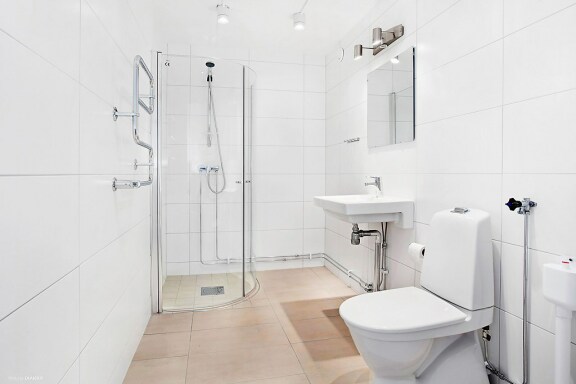 I källaren finns en gemensam tvättstuga som enkelt bokas via ett modernt taggsystem.