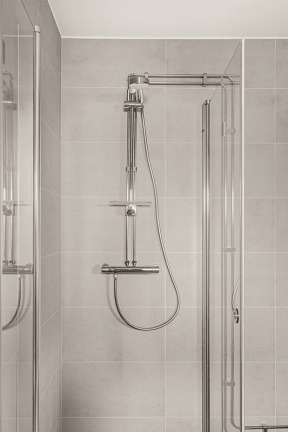 Badrummet blir helkaklat och inreds med dusch med rundade glasväggar, handdukstork, nytt porslin, badrumsskåp samt kombinerad tvättmaskin och torktumlare – en praktisk och bekväm lösning i vardagen.
