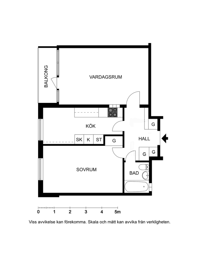 Badrummet är erbjuder vitt kakel på väggarna och mörk klinkers på golvet. Utrustningen består av wc, tvättställ och badkar. Lägenheten har ett vitt kök från JKE med vitvaror inkl diskmaskin och på golvet ligger ekparkett. I vardagsrum, sovrum och hall är väggar målade i vitt, ekparkett på golven och garderober finns i hallen och ett av sovrummen. Via vardagsrummet når du balkongen.