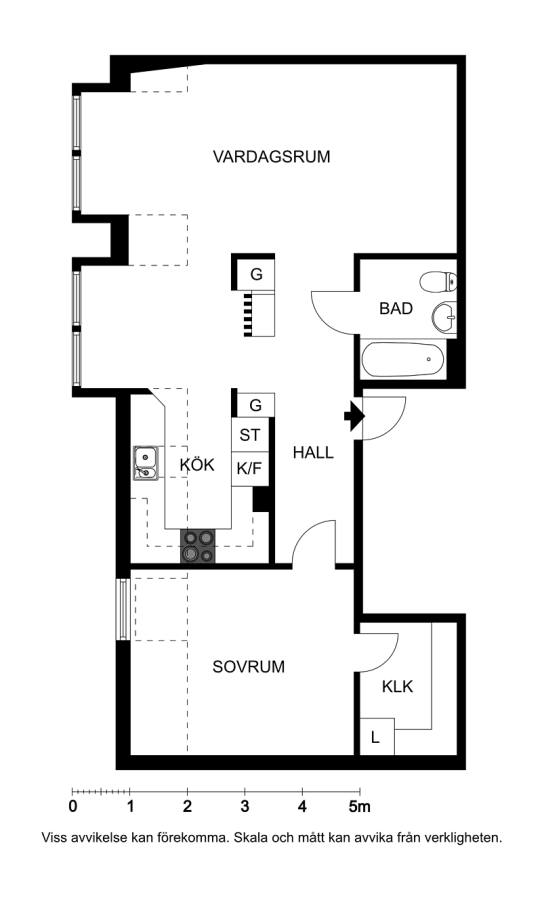 Lägenheten har ett kök med vita luckor och plastmatta. Vardagsrummet är utrustat med parkettgolv och fransk balkong som ger ett trevligt ljus. Badrummet är äldre, kaklat och utrustat med badkar. Sovrummet har laminatgolv och direkt access till en rymlig klädkammare som ger goda förvaringsmöjligheter.
