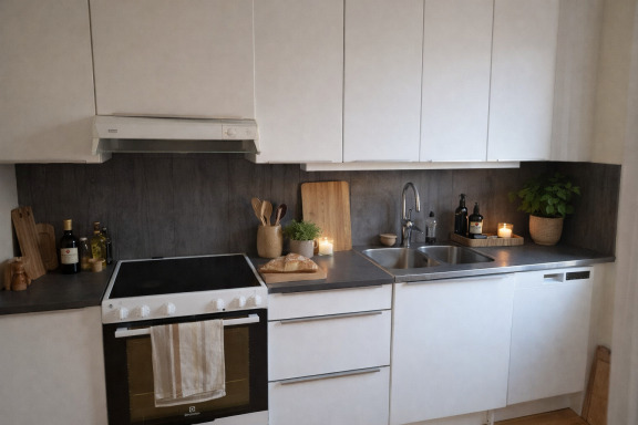 Köket är utrustat med eleganta vita luckor från JKE Design som tillsammans med diskmaskinen ger både funktionalitet och ett rent, modernt uttryck. Badrummet är helkaklat i klassiska färger och utrustat med dusch, vilket skapar en fräsch och lättskött miljö.