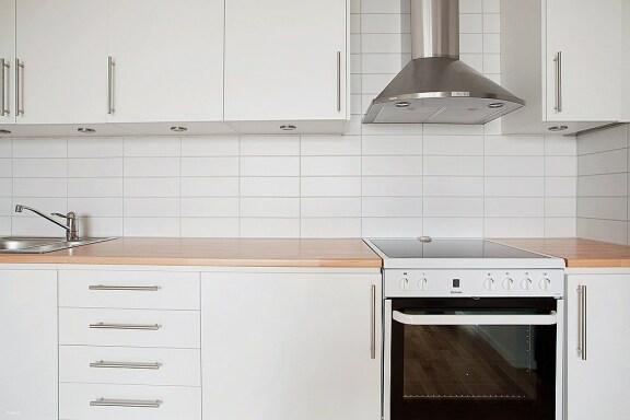 Lägenheten har vitmålade väggar och parkettgolv. Kök med vitvaror och parkettgolv. Badrummet är helkaklat med duschväggar och handdukstork.