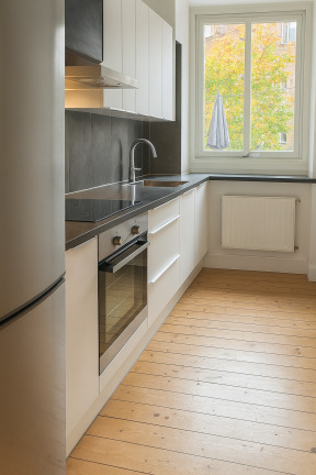 Nyare kök med vita luckor från JKE och ekparkettgolv