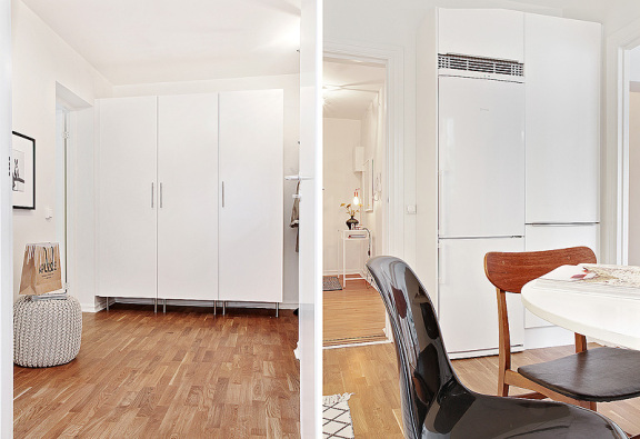 På golvet i hallen ligger praktisk klinker som därefter övergår till ett genomgående och charmigt parkettgolv. Lägenheten fördelar sina 69 kvm på tre rum och kök.
